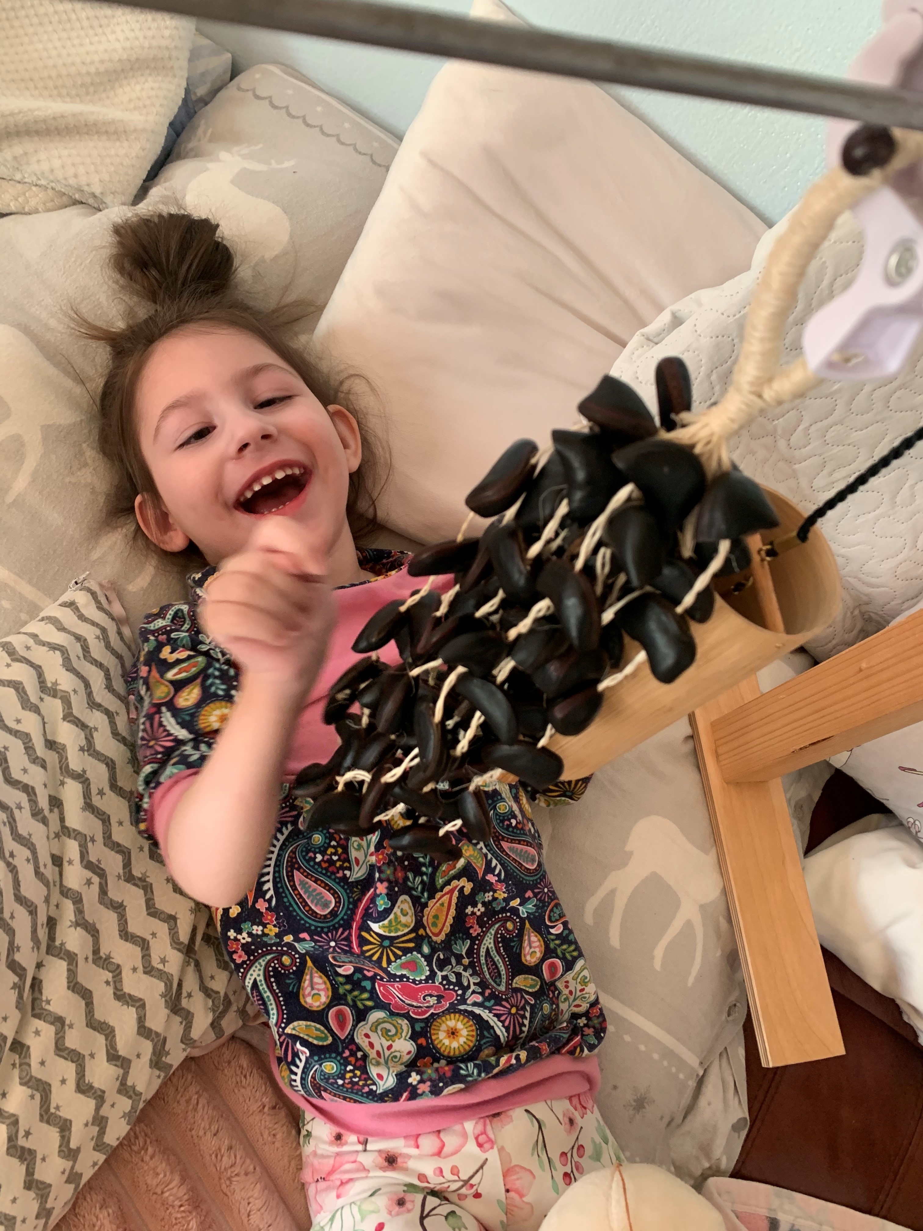 "Dobrý den, chceme všem moc poděkovat, že naší Natálce mohl přicestovat nádherný dárek – muzikoterapeutické ořechy, jejich zvuky si užíváme celá rodina a zavěšujeme je Natálce na hrazdičku, kde si spolu se svou čtyřměsíční sestřičkou s nimi hrají a moc si to užívají 😊 Natálku to motivuje zvedat ručičky a zapojovat tak svaly, které kvůli svému postižení téměř nepoužívá, jedině když objeví něco velmi zajímavého, co ji přinutí ručičky zvednout. Zároveň se tím může projevit, k čemuž také nemá tolik možností jako zdravé děti. Velice děkujeme, že naší Natálce děláte tak velkou radost ❤️" maminka Natálky