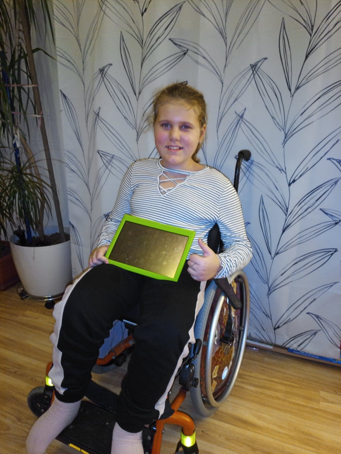 Musí používat hodně kompenzačních pomůcek…invalidní vozík, vertikalizační stojan, dlahy (ortezy) na nohy, elektrokolo, stropní zvedací systémy. Pravidelně musí rehabilitovat, plavat, 2x ročně jezdí do lázní. Péče o Kristýnku je 24 hodinová a přesuny na vozík, nebo kamkoliv mimo domov, sama nezvládá.