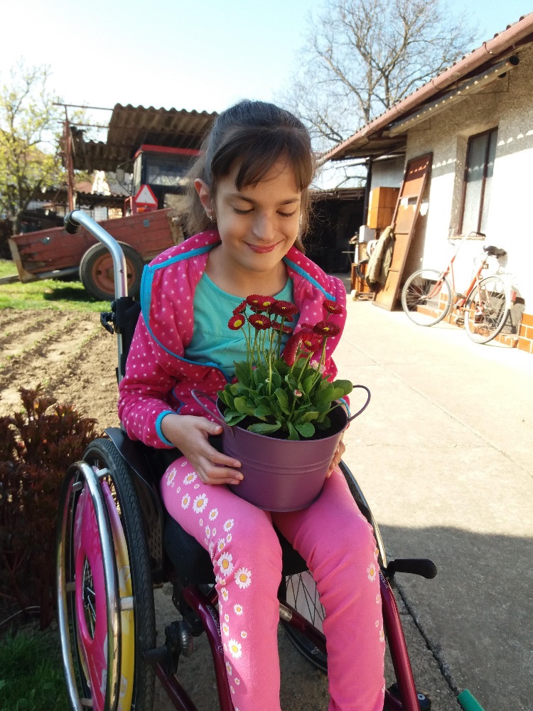 Na svém invalidním vozíčku se na kratší vzdálenost dokáže sama pohybovat, např. po třídě ve speciální škole v Uherském Hradišti, doma nebo na zahrádce. Bez vozíčku se dokáže "šoupat" po zemi po zadečku.