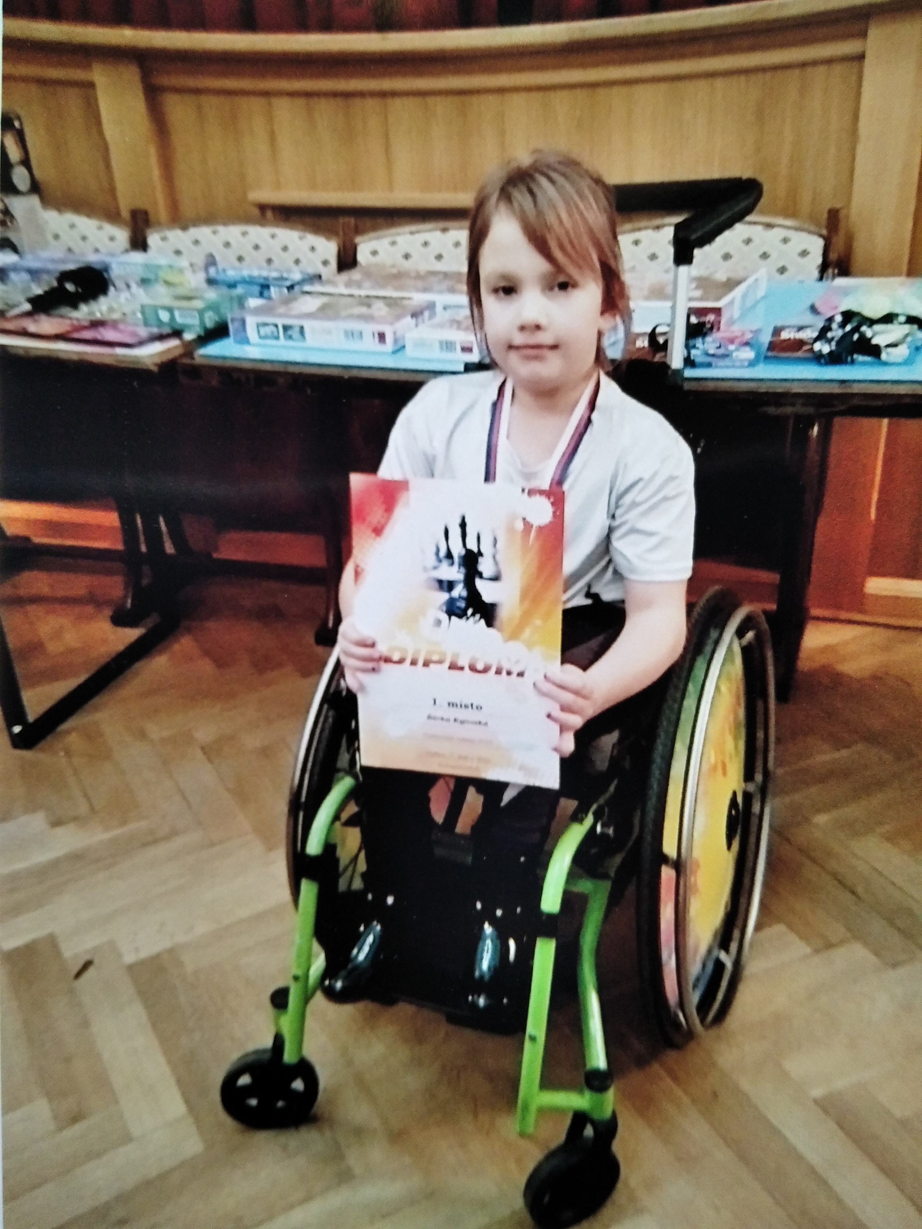 „Jmenuji se Šárka, narodila jsem se předčasně ve 33 týdnu, zdravá jako řípa. Veškerý vývoj probíhal podle tabulek, rostla jsem, ale pouze do roku a půl. Po genetickém vyšetření se potvrdila diagnóza spinální svalová atrofie SMA typ II. Dochází k ochabování svalů v celém těle, a to symetricky. Obě strany těla jsou postiženy stejně. V mém případě jsem odkázaná na invalidní vozík a nejvíce mám postižené dolní končetiny. Nejsem schopna na nich stát. Mám slabý i trup, ale ruce mi zatím fungují na jedničku. Mým koníčkem jsou šachy, které hraji od 5 let. Už mám několik zlatých medailí.
