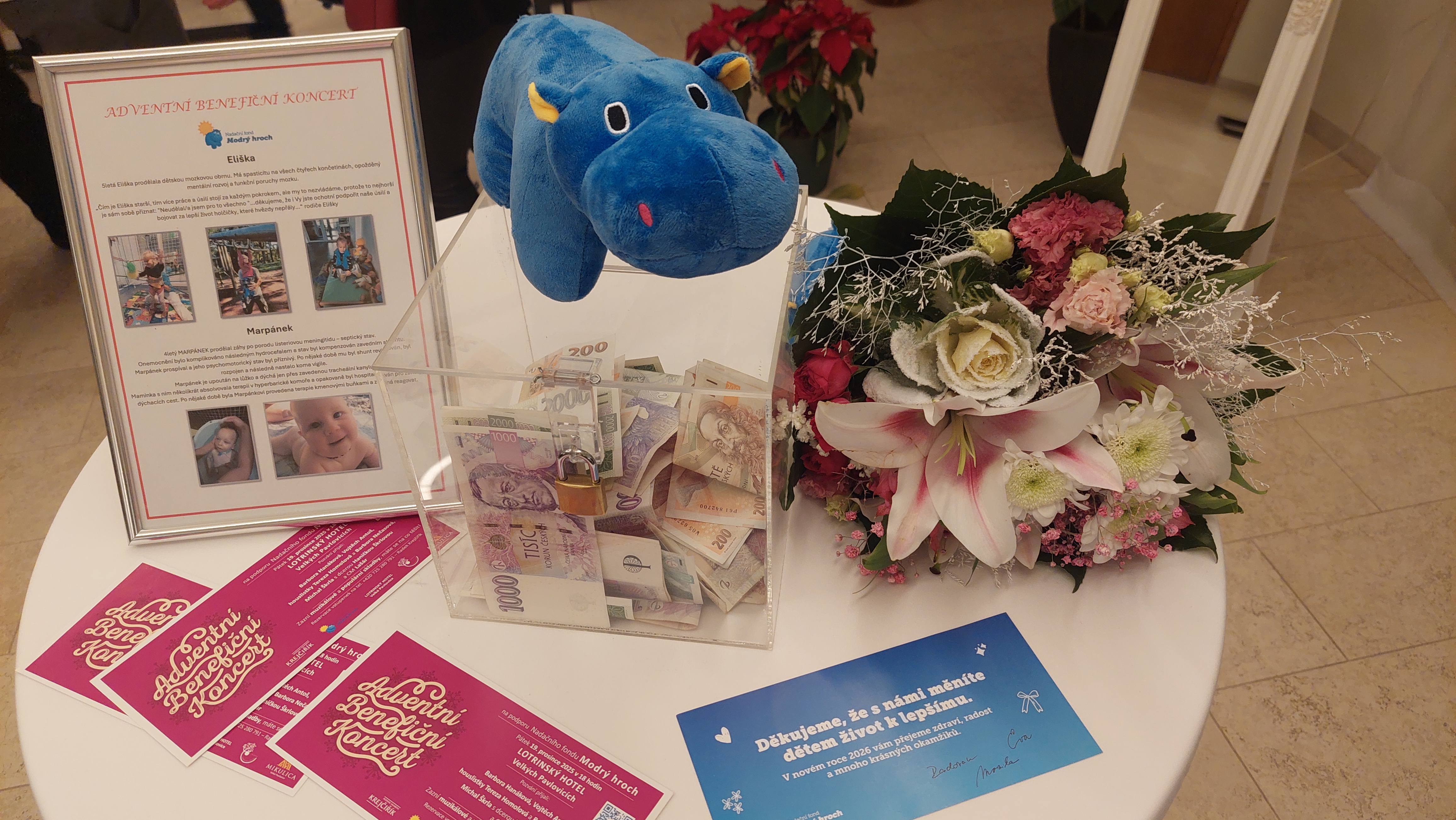 Díky štědrosti všech návštěvníků a dárců se podařilo vybrat krásnou částku 144 682 Kč, která poputuje na přímou pomoc Elišce a Marpánkovi.